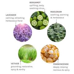 Helianthus annuus (Sunflower) seed oil~, Polyglyceryl-4 oleate, Lavandula angustifolia (Lavender) herb oil*, Citrus aurantium bergamia (Bergamot) peel oil*, Boswellia serrata (Frankincense) oil*, Origanum majorana (Sweet Marjoram) leaf oil*, Vetiveria zizanoides (Vetiver) root oil*, Tocopherol, Limonene, Linalool.